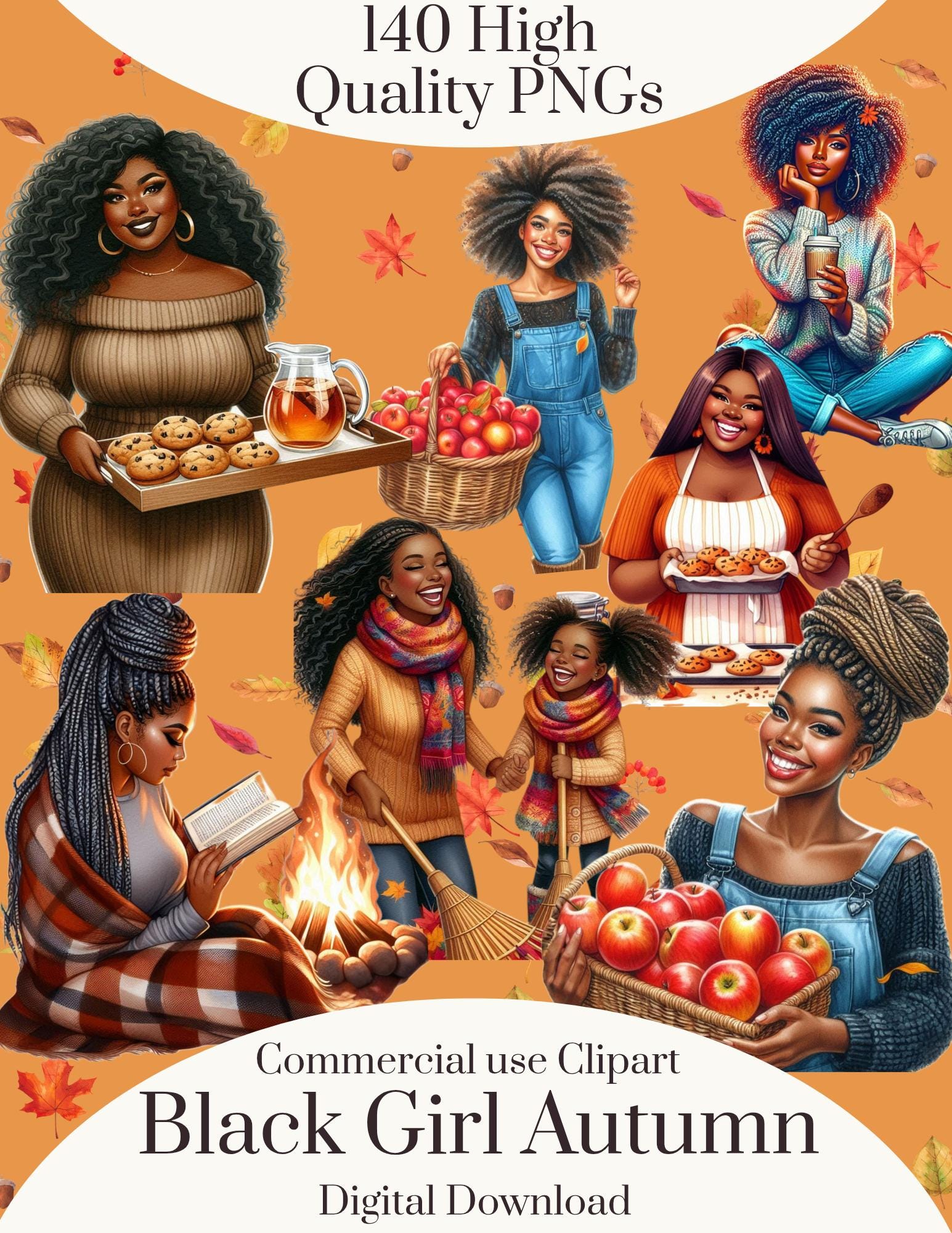 Bring cozy fall vibes to your projects with this digital clip art set featuring African American women enjoying autumn activities—apple picking, sipping lattes, reading outdoors, and more. Designed with rich seasonal colors and transparent backgrounds, these illustrations are perfect for: