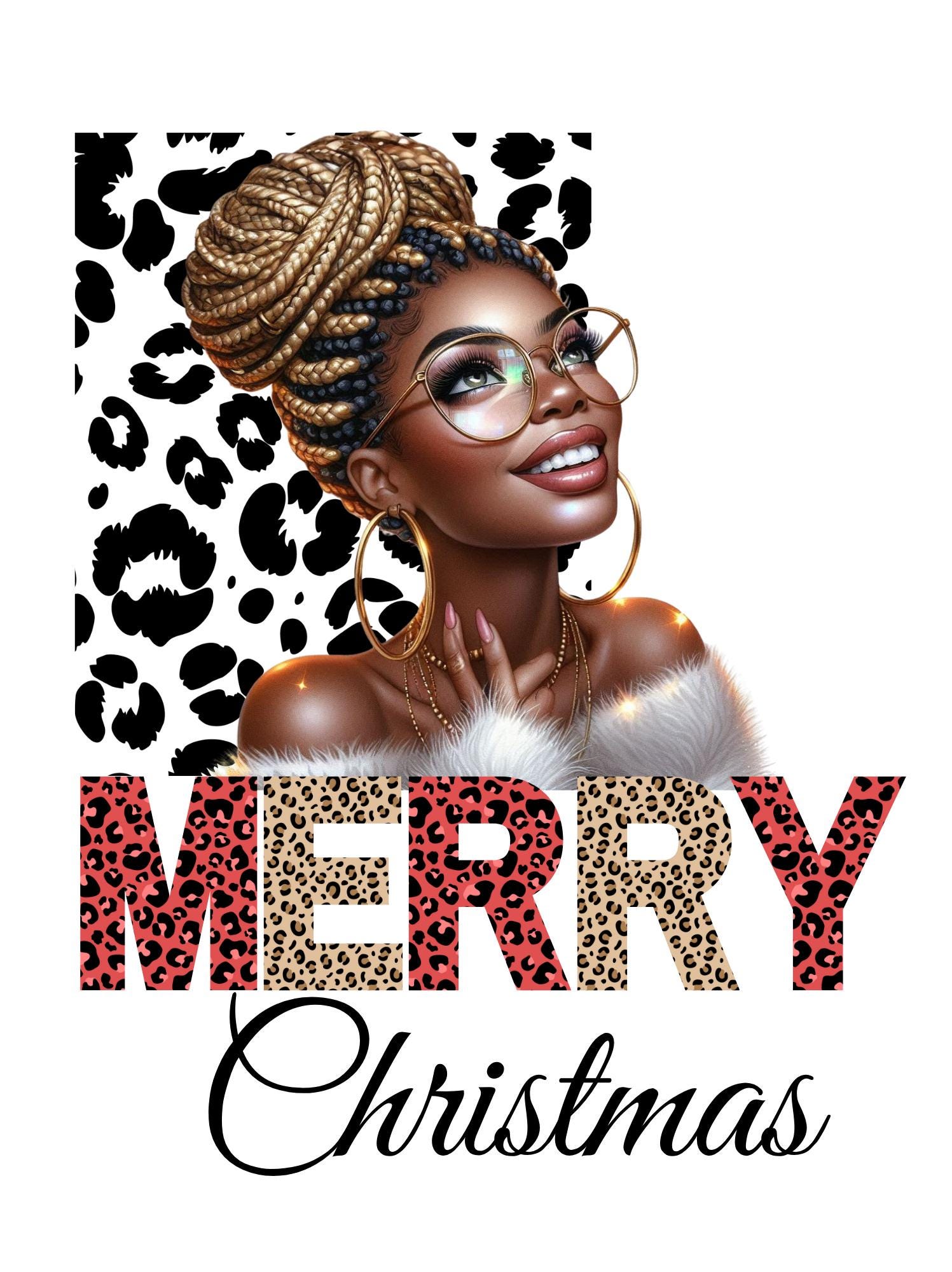 Printed on a soft white cotton shirt, this design features a beautifully illustrated woman with braided updo, oversized glasses, gold hoop earrings. She’s framed against a trendy black-and-white animal print background that adds a modern, eye-catching touch.