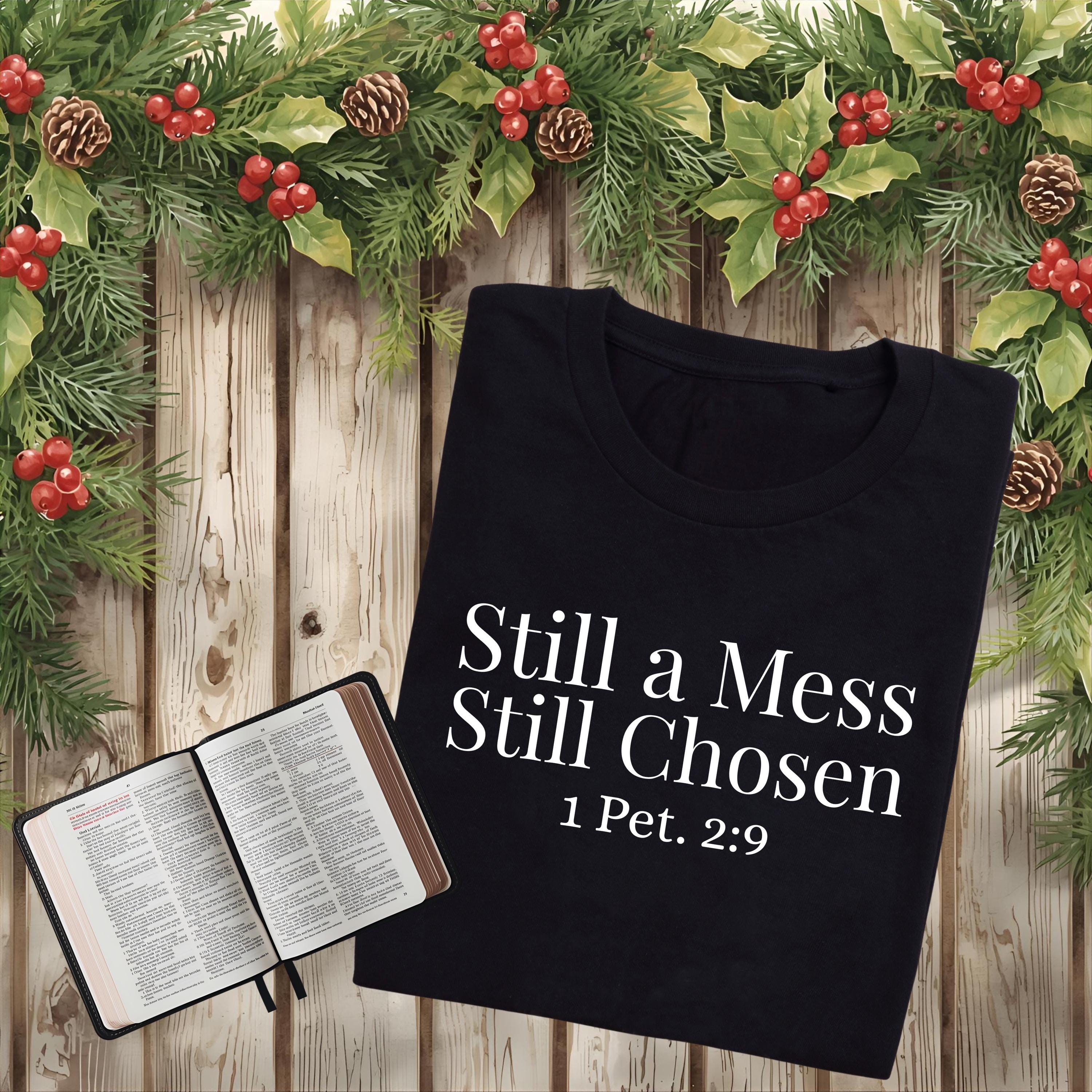 This unapologetically bold tee is a wearable affirmation for anyone walking through grace with grit. Featuring the powerful declaration “Still a Mess, Still Chosen” and anchored in 1 Peter 2:9, this shirt reminds us that divine purpose isn’t reserved for perfection—it’s for the called.